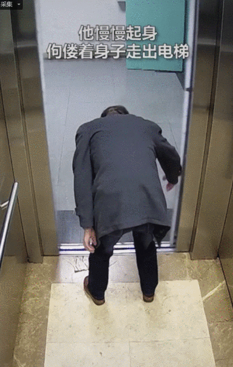 摔倒后,他佝僂著身子走出電梯,又一頭栽倒在地,磕
